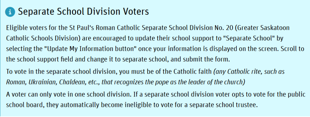 Some people are confused which school division they vote in. According to the City of Saskatoon site, you can only cast a vote for one School Division. In order to vote for the separate system you need to be must be of the Catholic faith, and you are encouraged to update your information on the voters list in advance.