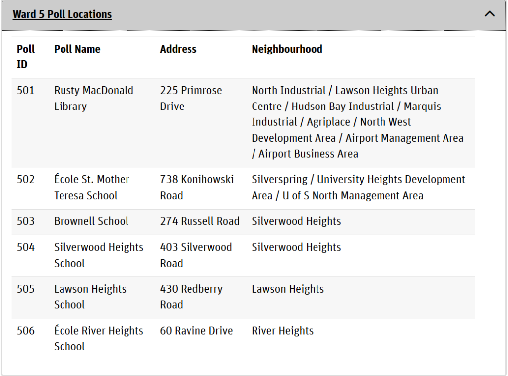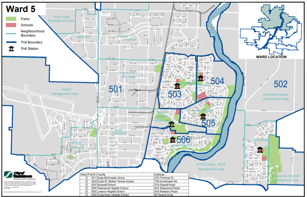 Ward 5 is roughly made up of Silverspring, River Heights, Lawson Heights and Silverwood Heights. If you aren’t sure if you are part of Ward 5 from looking that this map, check the City of Saskatoon page above to find out if you are registered and what ward you are in.